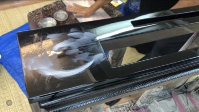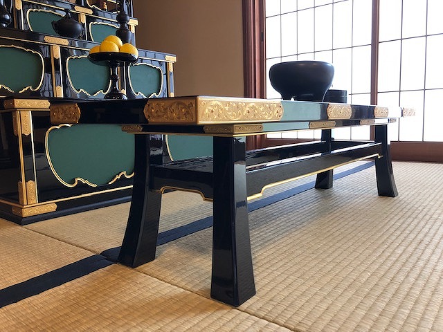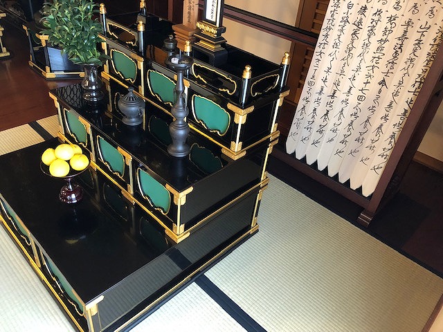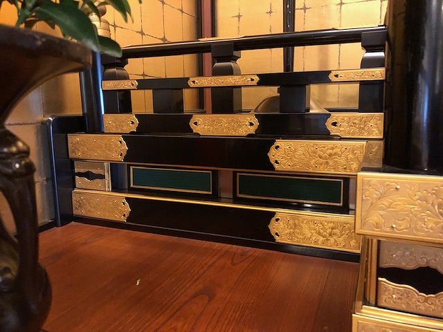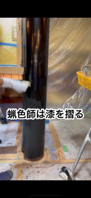 今回は、お内陣の外陣正面、現場へ出張し蝋色の作業です。
